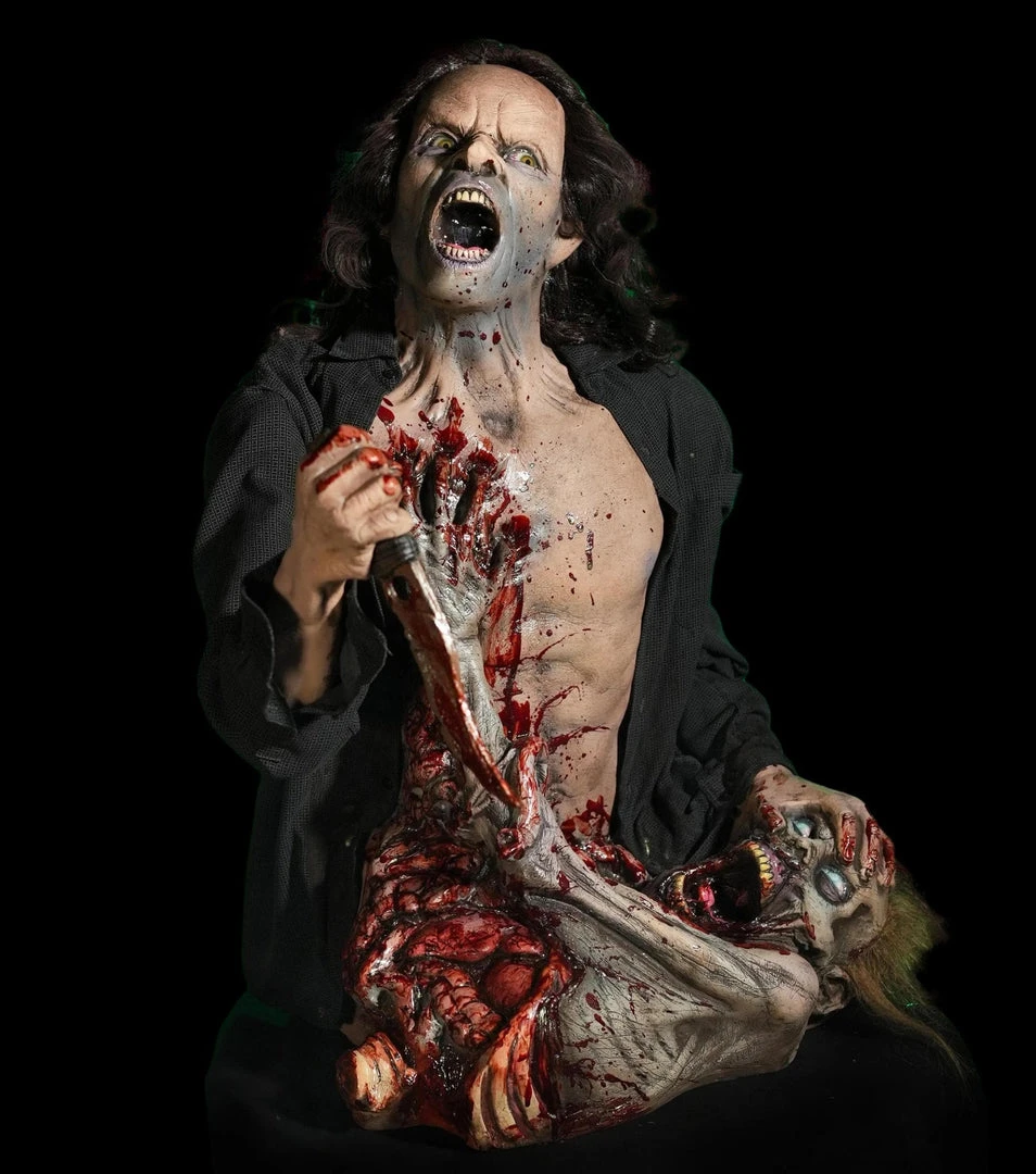 STATIC PROP version of our Zombie Killer. This amazingly detailed Halloween prop shows a Zombie Killer who is in a fight for his life during the zombie apocalypse. This amazing 2021 static Halloween prop will work great in a home haunt, zombie scene, or haunted house.Â