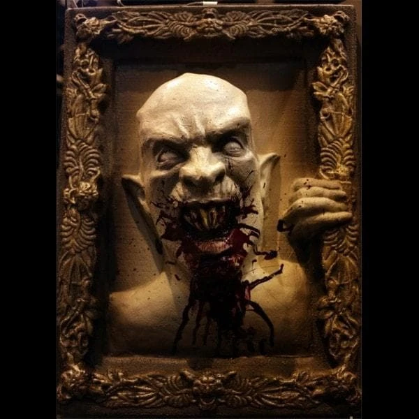 Bloody monster portrait is ready to hang. Â Latex and foam prop is approx. 36in. x 24 in. x 12 inches deep