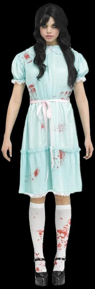 Become your true twisted self with this new costume which makes it look as if your costume is on backwards! Light blue dress with white polka dot pattern with high neckline and reverse look apron with blood-spatter markings on dress, knee highs socks included with blood spatter design. Shoes not included.