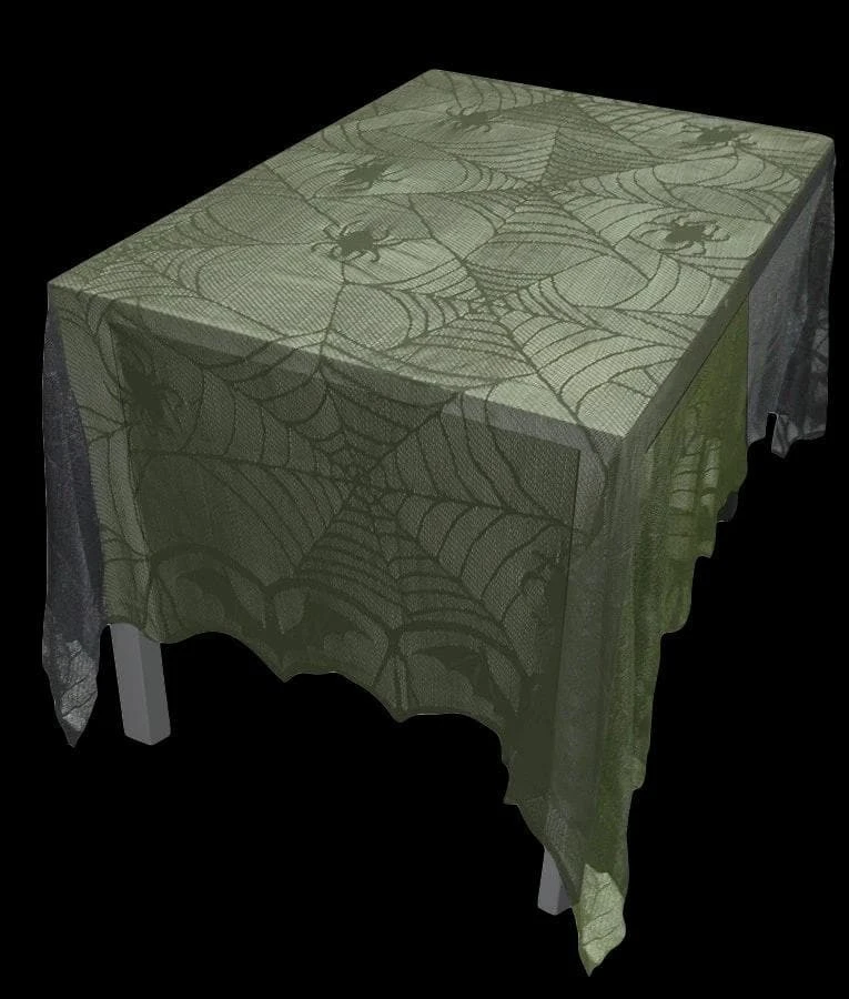 Woven polyester lace tablecloth with bat and spider web pattern. Measures 48 inches x 96 inches.