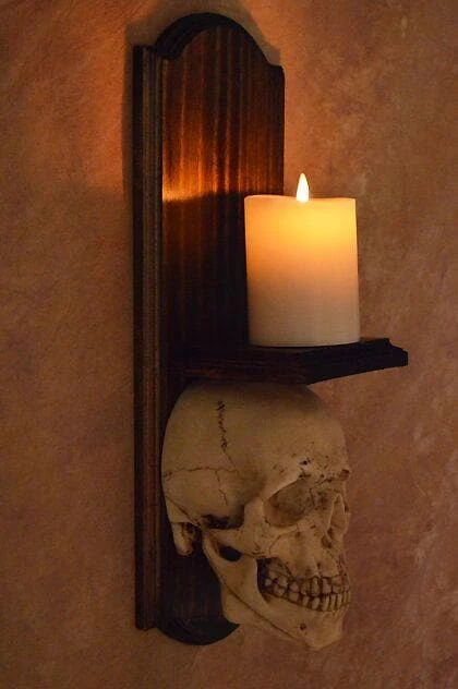 Classic Skull Wall Sconce, style II, on wood frame with 3″x4″ Ivory wax moving flameless candle. Help give that hallway or dark area some needed eerie lighting. Size is 18″ tall by 6″ across.