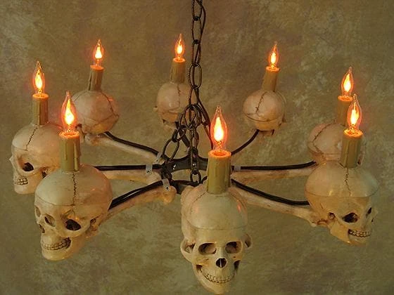 This well constructed skull chandelier, made with eight medium size skulls in a wagon wheel fashion, would be great for any Halloween or Horror event. It is made in a wagon wheel fashion that is 23″ across and just about 8″ high. This chandelier is great for a low ceiling. The hanging weight is just about 13 pounds.
