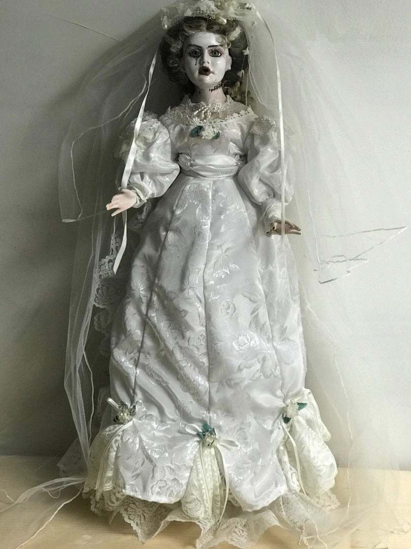 Frankenstein’s Bride. This creepy little girl doll has a porcelain head, hands and legs on cloth body. She is a 22″ doll. She has blue eyes with brown gray hair. Dressed in a beautiful white wedding dress with White shoes and white veil.