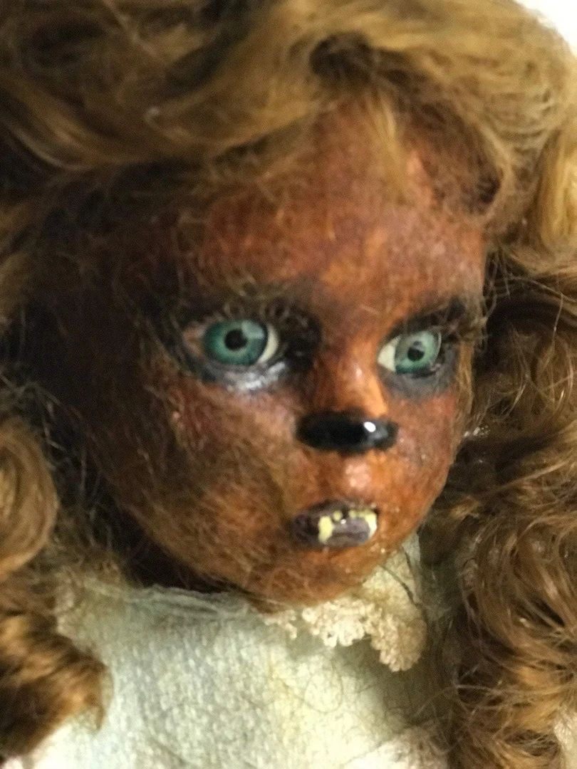 Wolfie the Werewolf, creepy little girl doll. Porcelain head covered in hair, arms and legs on cloth body. She is 20″ tall, Brown hair and Blue Green eyes. Dressed in a dirty green victorian dress and covered in hair.