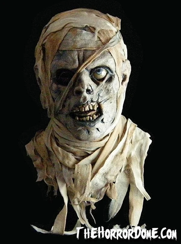 Unwisely awoken from his eternal deep sleep, The Mummy has risen and requires a feast. Cursed, embalmed, wrapped in bandages and sealed in a stone sarcophagus, this zombie-like monster is a unique form of the living undead. From terrorizing fortune seekers who look to pillage his tomb, to feasting on warm human flesh of innocent victims, this fierce pharaoh can only be stopped by reading a from the book of the dead. Now, how’s your ancient Egyptian? This Mummy Halloween mask from the talented artists and craftspeople at The Horror Dome is an over the head design that will look frighteningly realistic with a body wrapped in gauze or tattered rags. A great collector’s piece, these premium masks are hand painted and exceptionally detailed. You’ll be all the rage at the next costume party, and scare the socks off the guests at your haunted house or neighborhood trick or treaters.